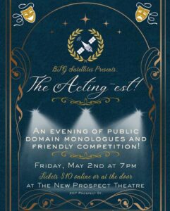 Are you the best actor in Bellingham? Are you willing to prove it? Then come play at BTG Satellites’ new pop-up theatre competition – THE ACTING-EST! Dare to present a public domain monologue for judgement, points, prizes and eventually, the honor of being Bellingham’s ACTING-EST ACTOR! Competition happens May 1st, deadline to enter is April 22 – send for more information at satellites@bellinghamtheatreguild.com for further information.