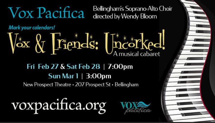Our high-energy cabaret show is baaaaack again at The New Prospect Theatre in downtown Bellingham, WA! This year’s Uncorked will continue our 7th Season’s theme of HOPE.  Our own Eva Sauvé will join us on piano along with Stephanie Straight on percussion, and Bruce Maurier on bass. We’ve invited several special Friends to perform with Vox Pacifica this year.